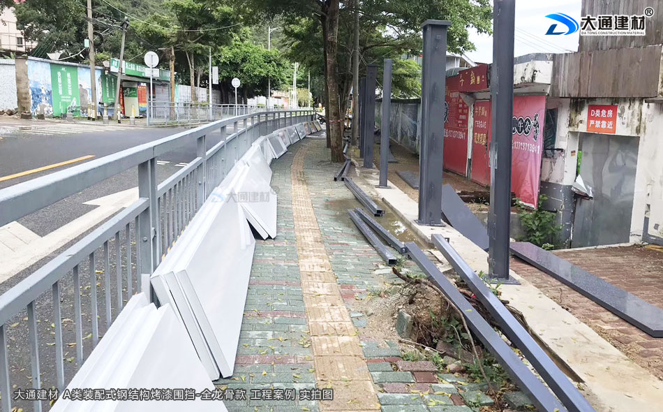 深圳市大通建材裝配式鋼圍擋全龍骨A款 采用裝配式+鋼結構+全龍骨 烤漆鋼板構造 安全穩固 抗風力強 美觀環保 經久耐用,應用于廣東省深圳市大鵬新區楊梅坑改造項目工程中,以下展示的圍擋圖片是大通建材裝配式鋼圍擋全龍骨A款在該項目部分位置的實拍圖