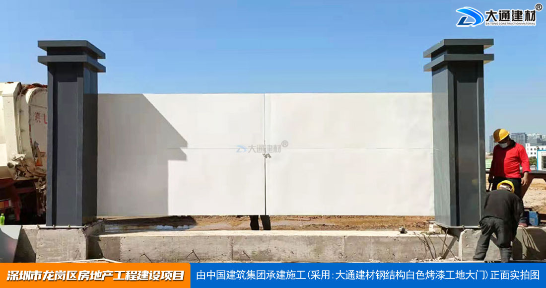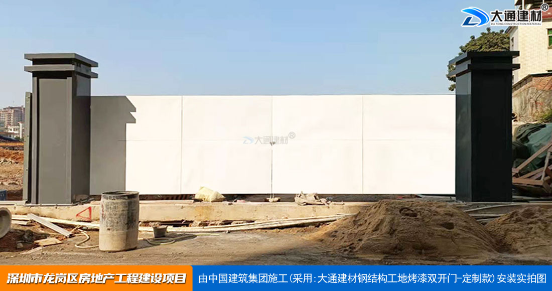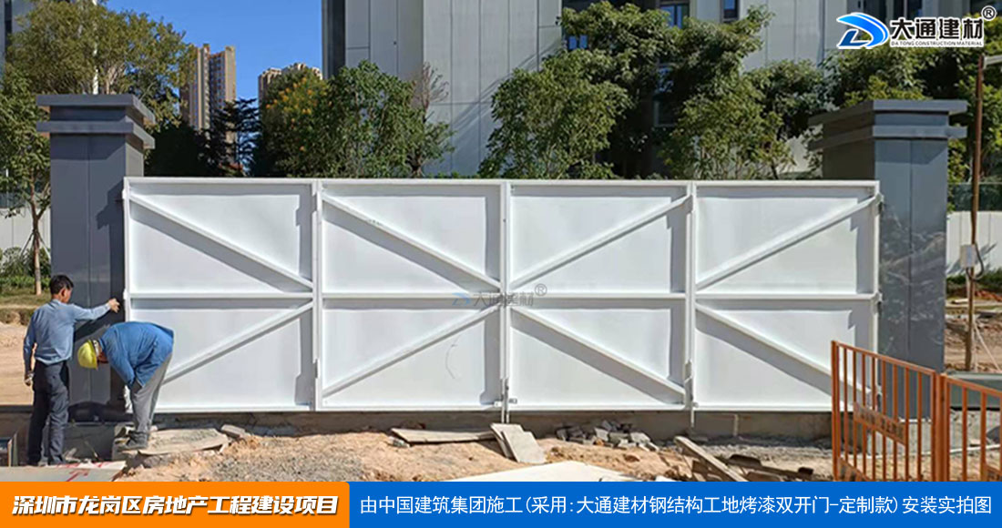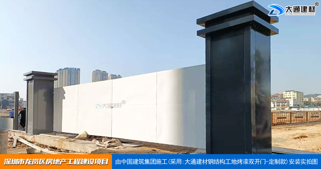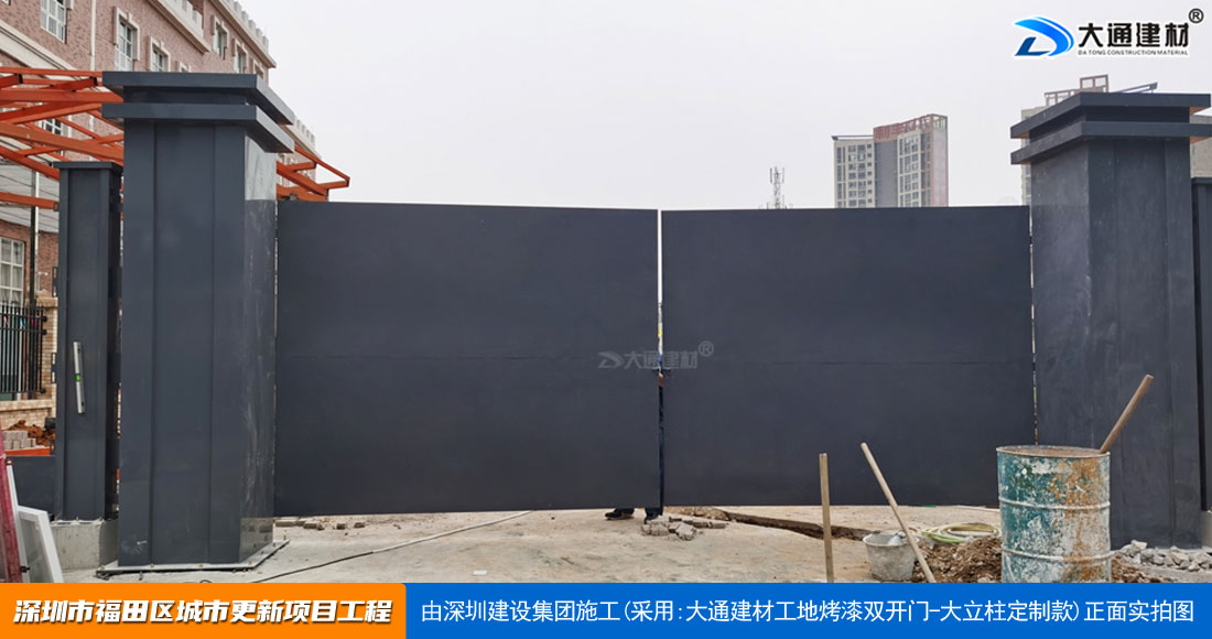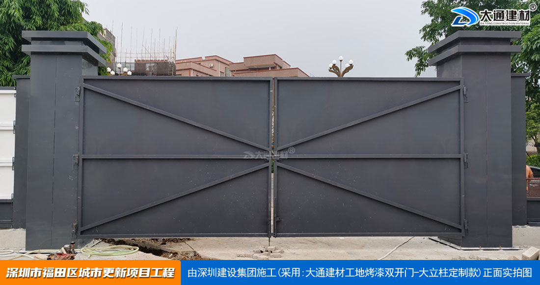 深圳大通建材生產(chǎn)銷售的工地烤漆雙開門-鋼結(jié)構(gòu)工地大門適用于各種市政工程項(xiàng)目、房地產(chǎn)項(xiàng)目、地鐵修建項(xiàng)目施工、管網(wǎng)改造、小區(qū)改造、城市建設(shè)、道路修建等工程項(xiàng)目使用