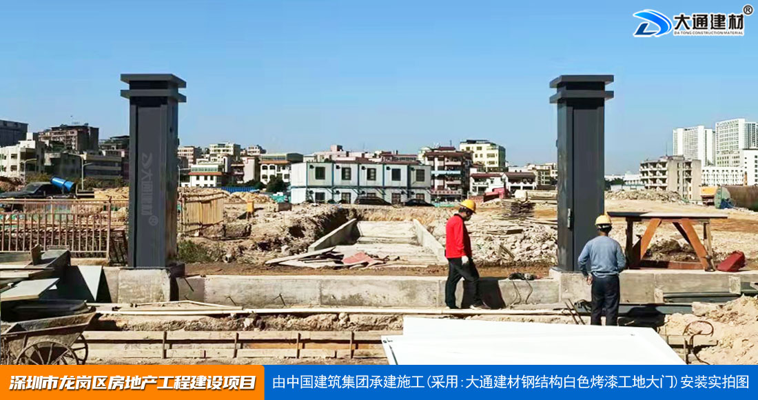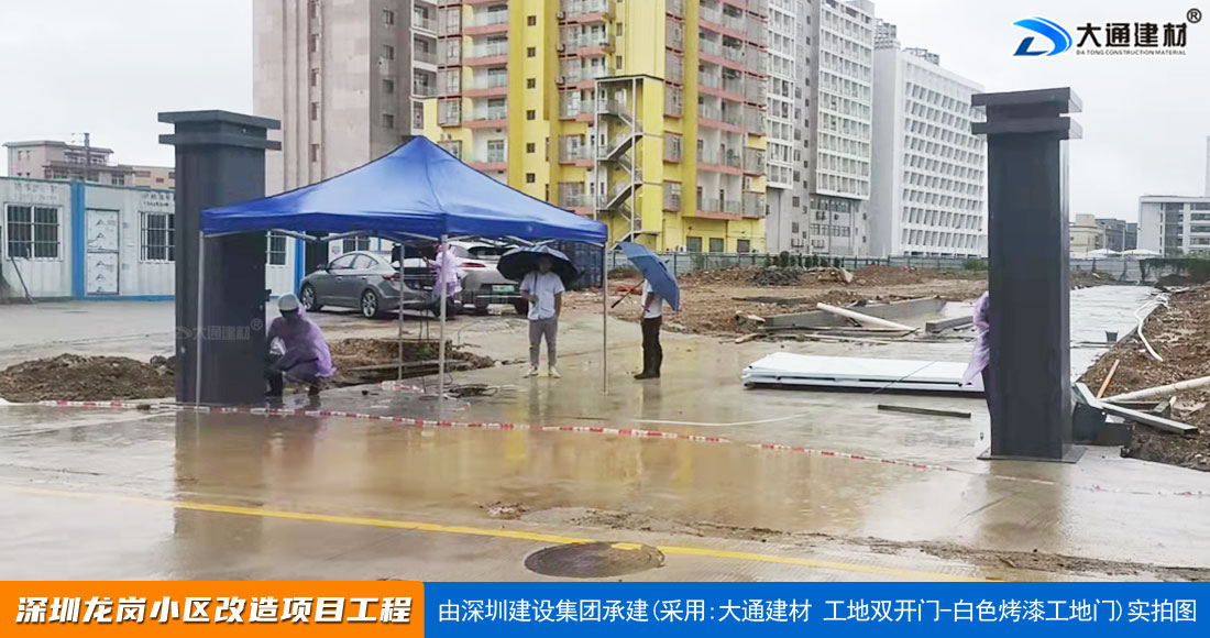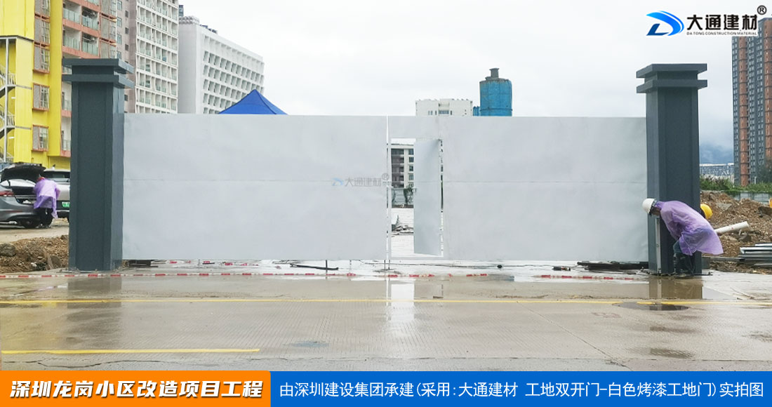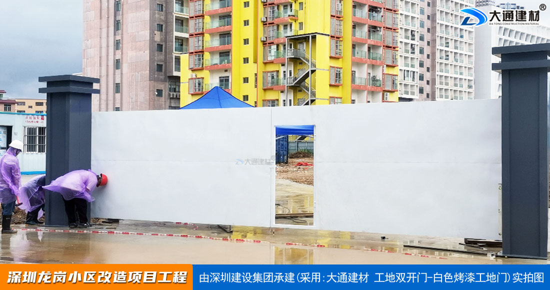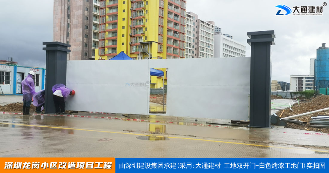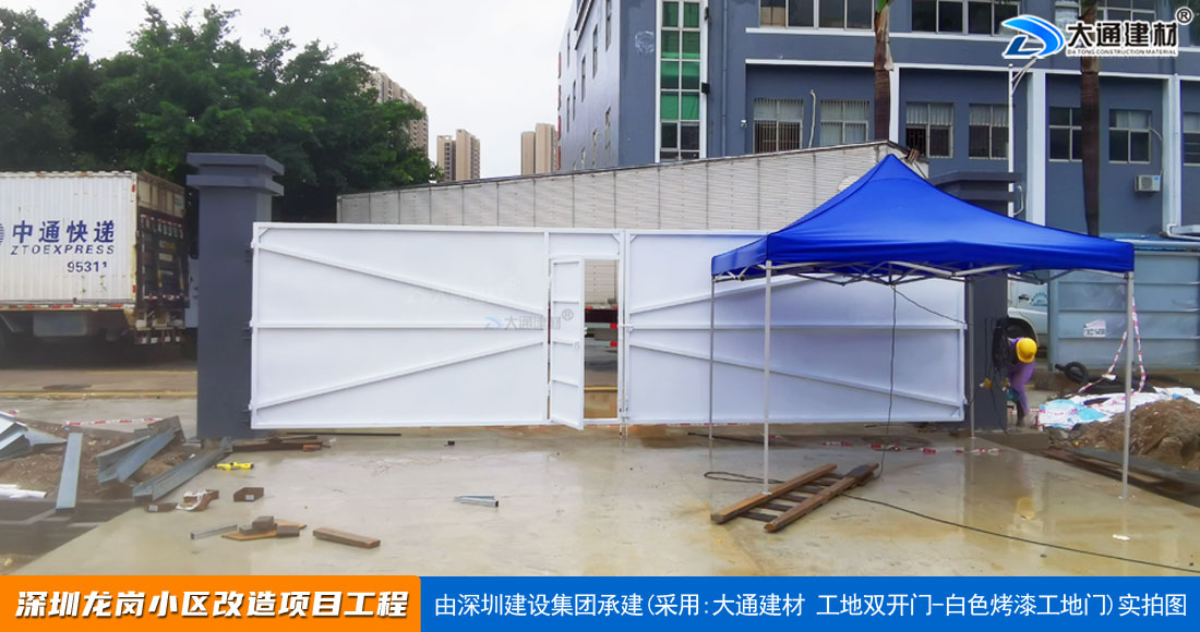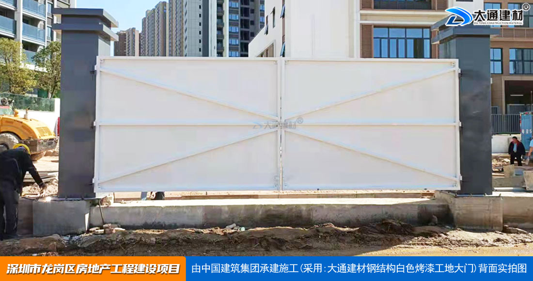 深圳大通建材生產(chǎn)銷售的工地烤漆雙開門-鋼結(jié)構(gòu)工地大門適用于各種市政工程項(xiàng)目、房地產(chǎn)項(xiàng)目、地鐵修建項(xiàng)目施工、管網(wǎng)改造、小區(qū)改造、城市建設(shè)、道路修建等工程項(xiàng)目使用