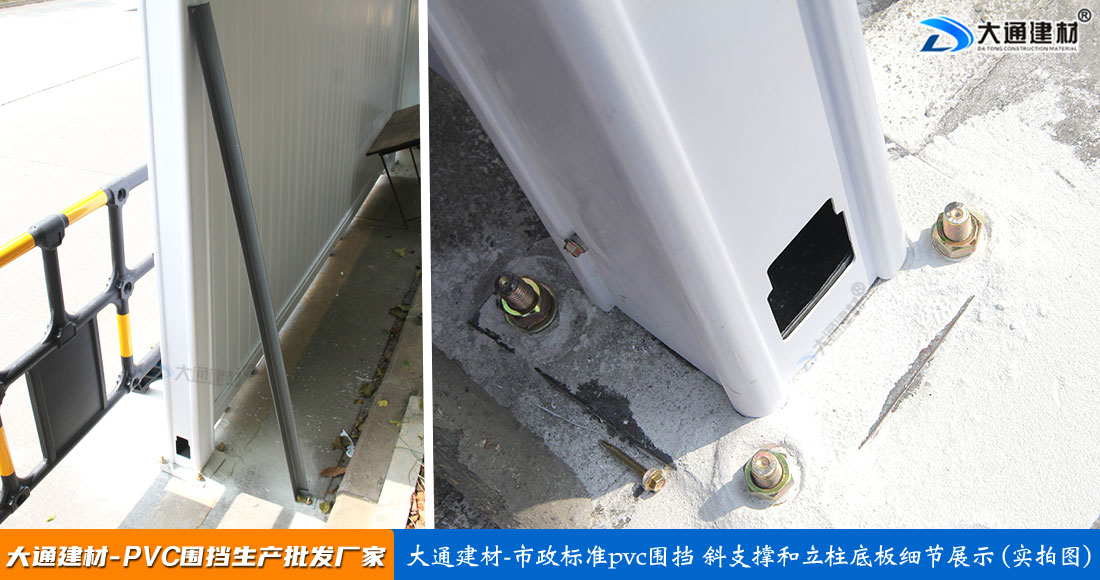 深圳市大通建材生產批發的市政標準PVC圍擋的圍擋墻板采用PVC長條版拼接,立柱、橫管均為PVC材料,內部均襯方通。立柱底板為鋼板,并加斜撐受力,來保證PVC圍擋抗風力更強、更安全穩固。大通建材常規款PVC圍擋尺寸長3mx高2.5m、長3mx高2.2m、長3mx高2m 其它PVC圍擋尺寸可按實際需要進行定制生產。
